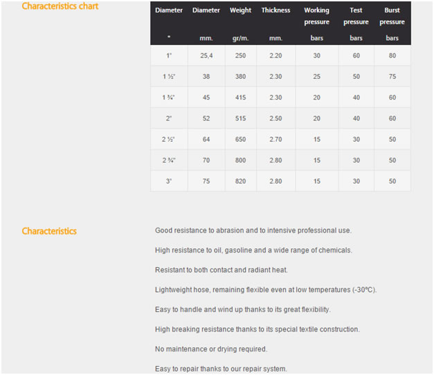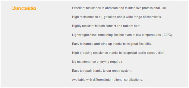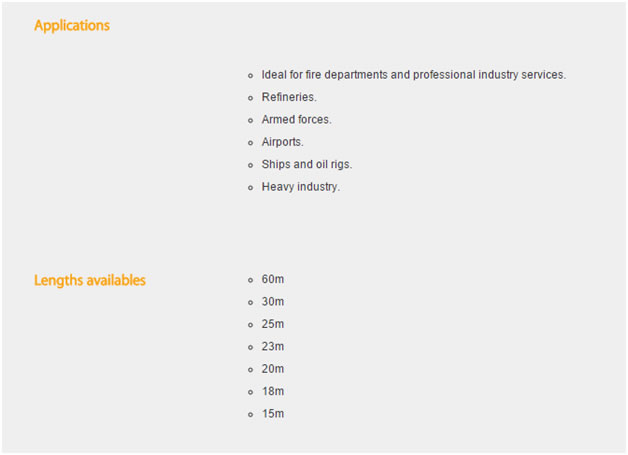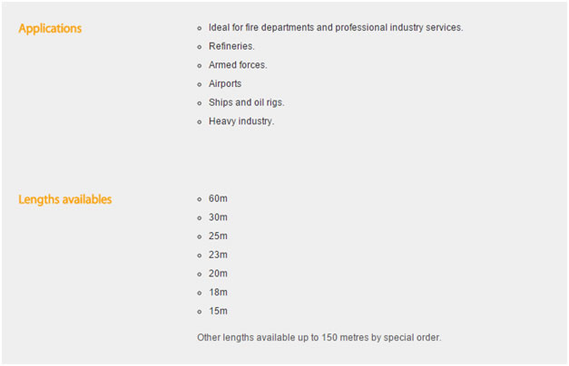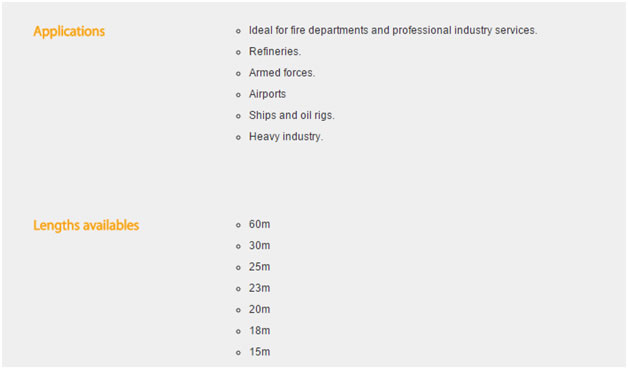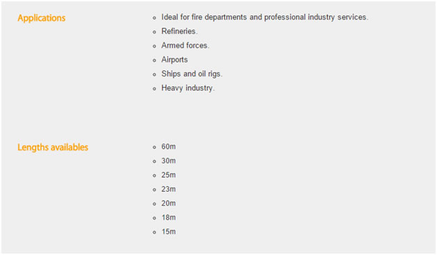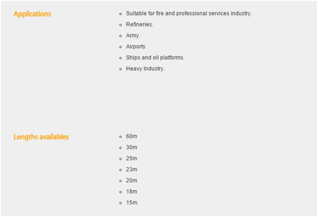We supply fire hoses manufactured by Productos Mesa in Spain, Productos MESA is one of largest fire hose manufacture in the world and export their product to more than 60 countries all over the world. Most of Poductos Mesa fire fighting hoses are produced and come available with different international approvals as UL19, BS6391:2009 type III kite marking, NFS61112, AS2792, DNV SOLAS, EN, etc Fire Hoses